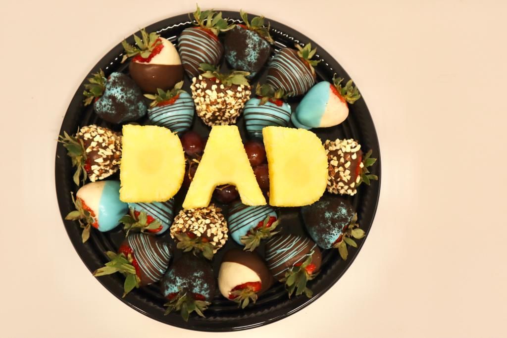 Our ultimate dipped fruit platter will not disappoint! This decadent dessert boasts an impressive assortment of fresh banana bites dipped in white and semisweet chocolate, semisweet chocolate dipped granny smith apple wedges, pineapple daisies, and more!
