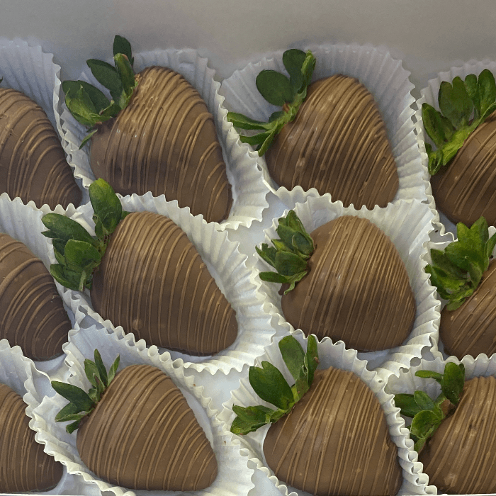 For milk chocolate lovers! 12 delicious strawberries dipped in real milk chocolate and drizzled with even more rich milk chocolate each berry is delicately hand dipped and decorated in real chocolate in our own kitchen for both culinary artistry and exquisitely decadent taste freshness and premium quality are 100 percent guaranteed.