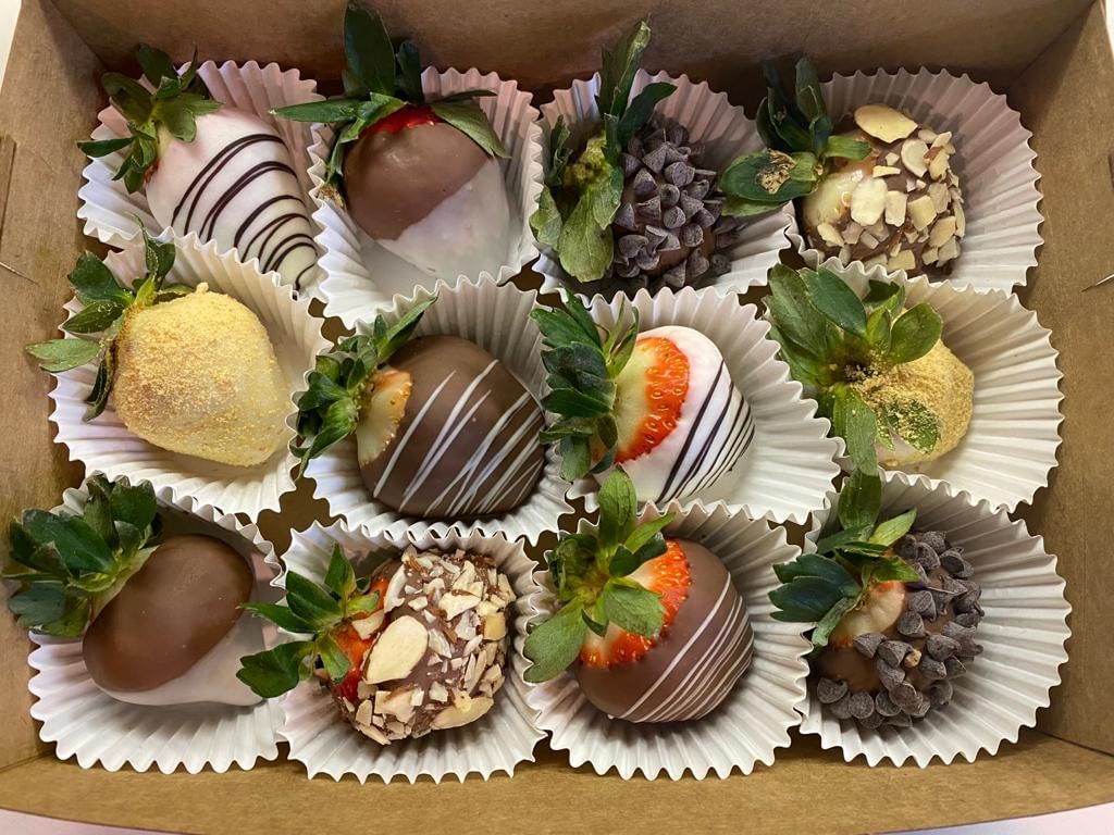 12 bite sized berries perfect for sharing! Each berry is dipped in real milk, dark or white chocolate and drizzled with even more rich real chocolate.